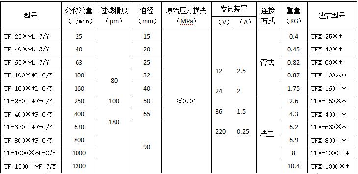 注:*为过滤精度,若使用介质为水-乙二醇,带ZS-I型发讯器,公称流量100L/min,过滤精度80µm , 滤器型号为:TF·BH-100×80L-C 滤芯型号: TFX·BH-100×80