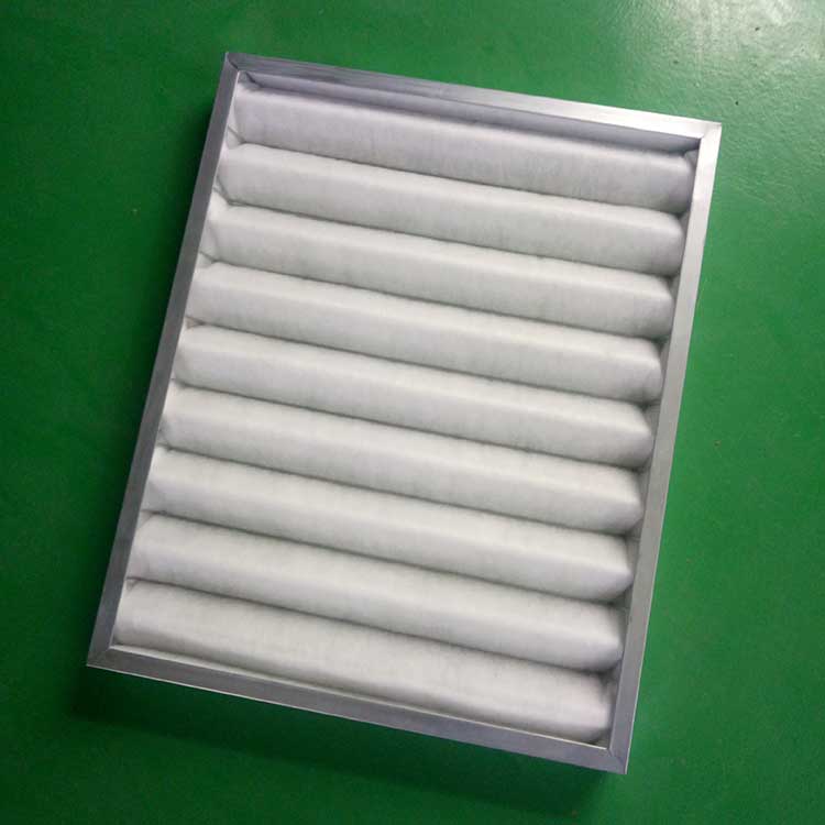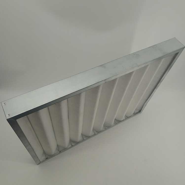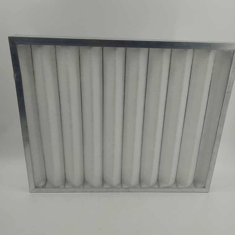 过滤材料是以折叠形式装入高强度模切硬纸板内,迎风面积增大。流入的空气中的尘埃粒子被过滤材料有效阻挡在褶与褶之间。洁净空气从另一面均匀流出,因此气流通过过滤器是平缓和均匀的。视过滤材料不同,它所阻挡的粒径从0.5μm到5μm而不同,过滤效率也不同 。